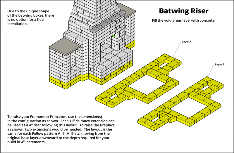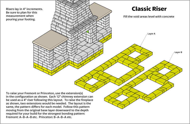 There may be many reasons you want to raise your fireplace. You can easily accomplish this customization. You need to think of the "Chimney Extension Kits" more as "Extension Kits" when looking to customize your outdoor fireplace kit. Chimney extensions are the most popular use, but not the only purpose. Each 12" extension is a half cube of Orion Block (14:14:18 blocks). This article and companion PDF will inform you on how you can turn those extensions into risers for your foundation. Note: This is for the Princeton and Fremont only. Rasing the Rockwell is not recommended. Click the image below for the PDF instructions that go with this article: